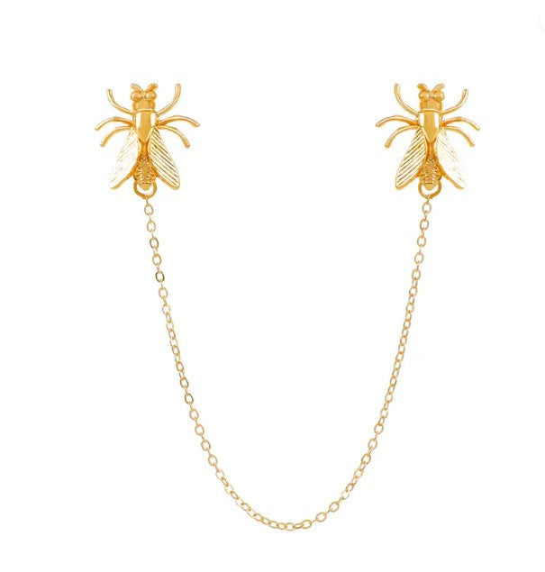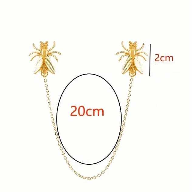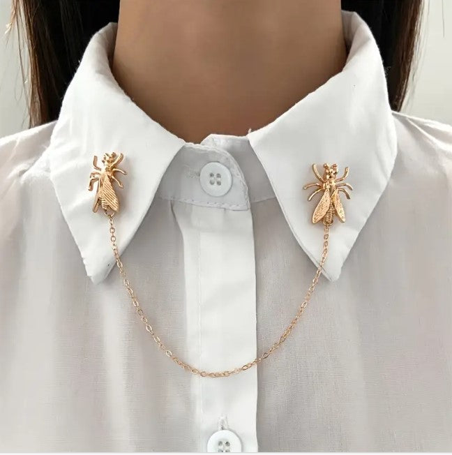 Prendedor que se puede utilizar en el cuello de la blusa o en la solapa. Tiene dos bichitos que están unidos por una cadenita. De color dorado muy brillante. Las medidas están en la última imagen.