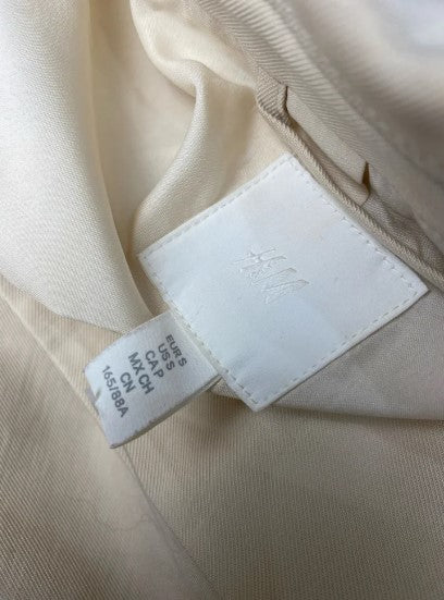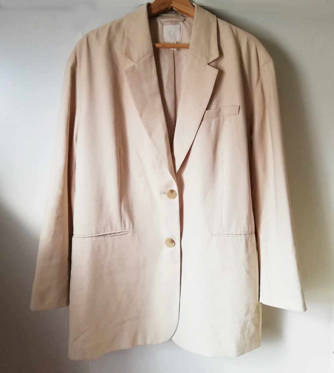 Blazer muy oversize, la etiqueta dice talla S, pero da hasta L o XL sin verse ajustado (mira las medidas). El material se ve mejor en la tercera imagen. Es de color beige lo que permite q se convierta en una prenda básica, fácil de combinar con otros colores. Marca H&M.