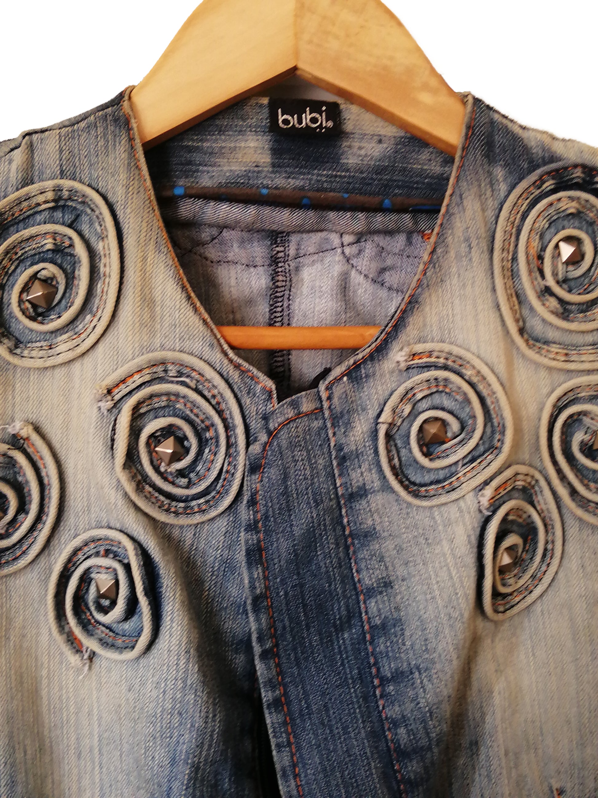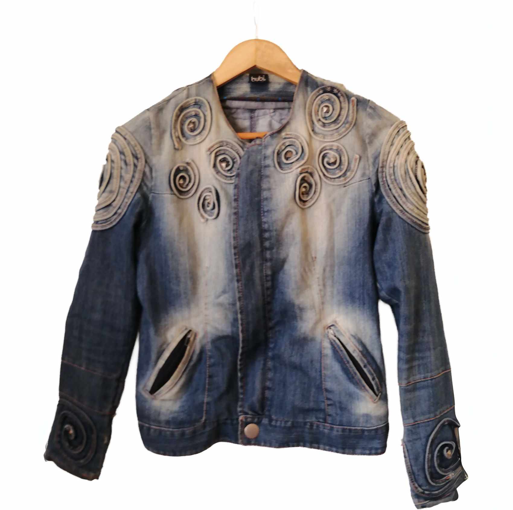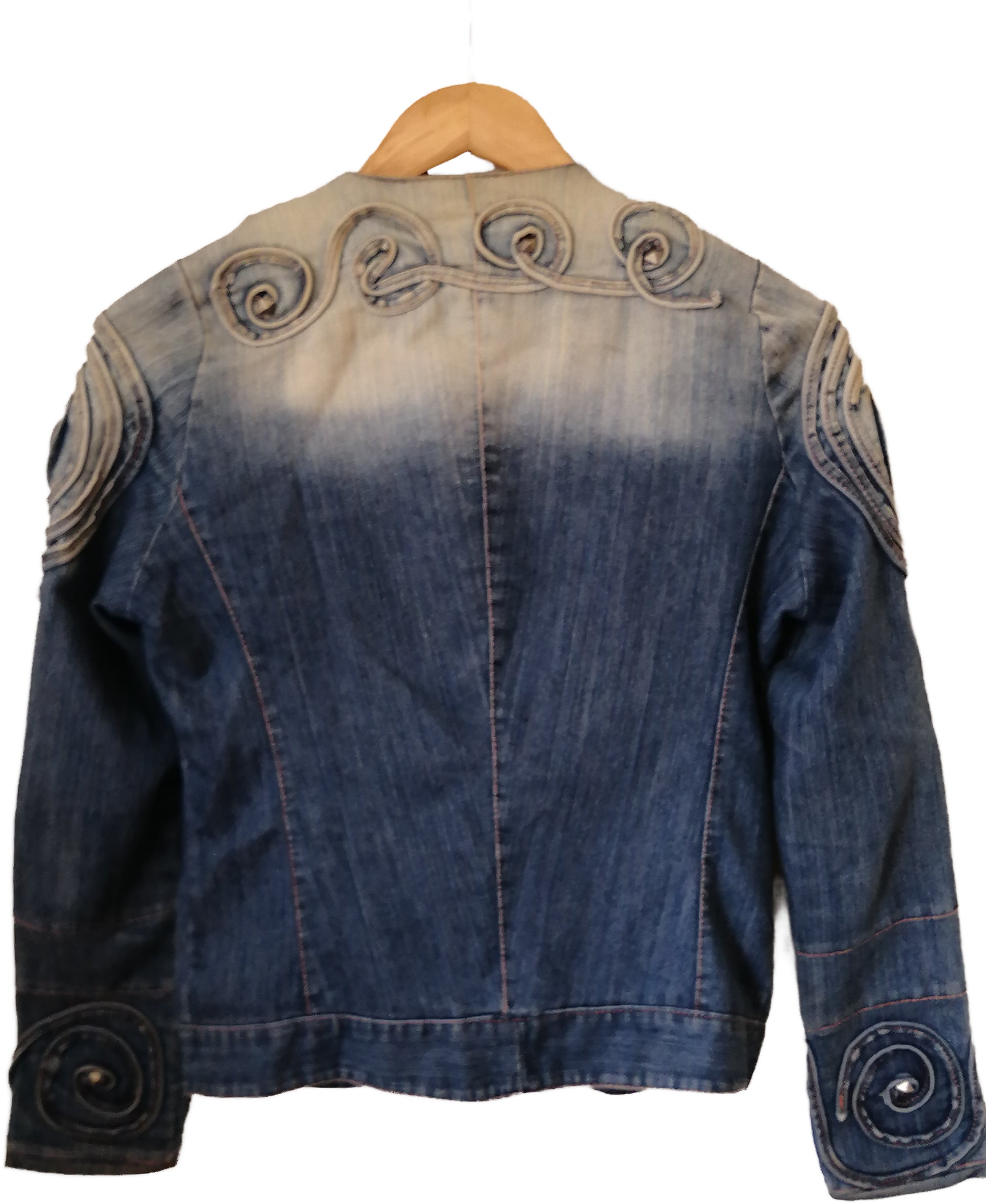 Chaqueta de jeans delgado, con aplicaciones y degradé. Tiene mucha onda, con cierre en la parte frontal, tiene bolsillos en los costados frontales. Cuello redondo. Es cortita, verifica las medidas a continuación.