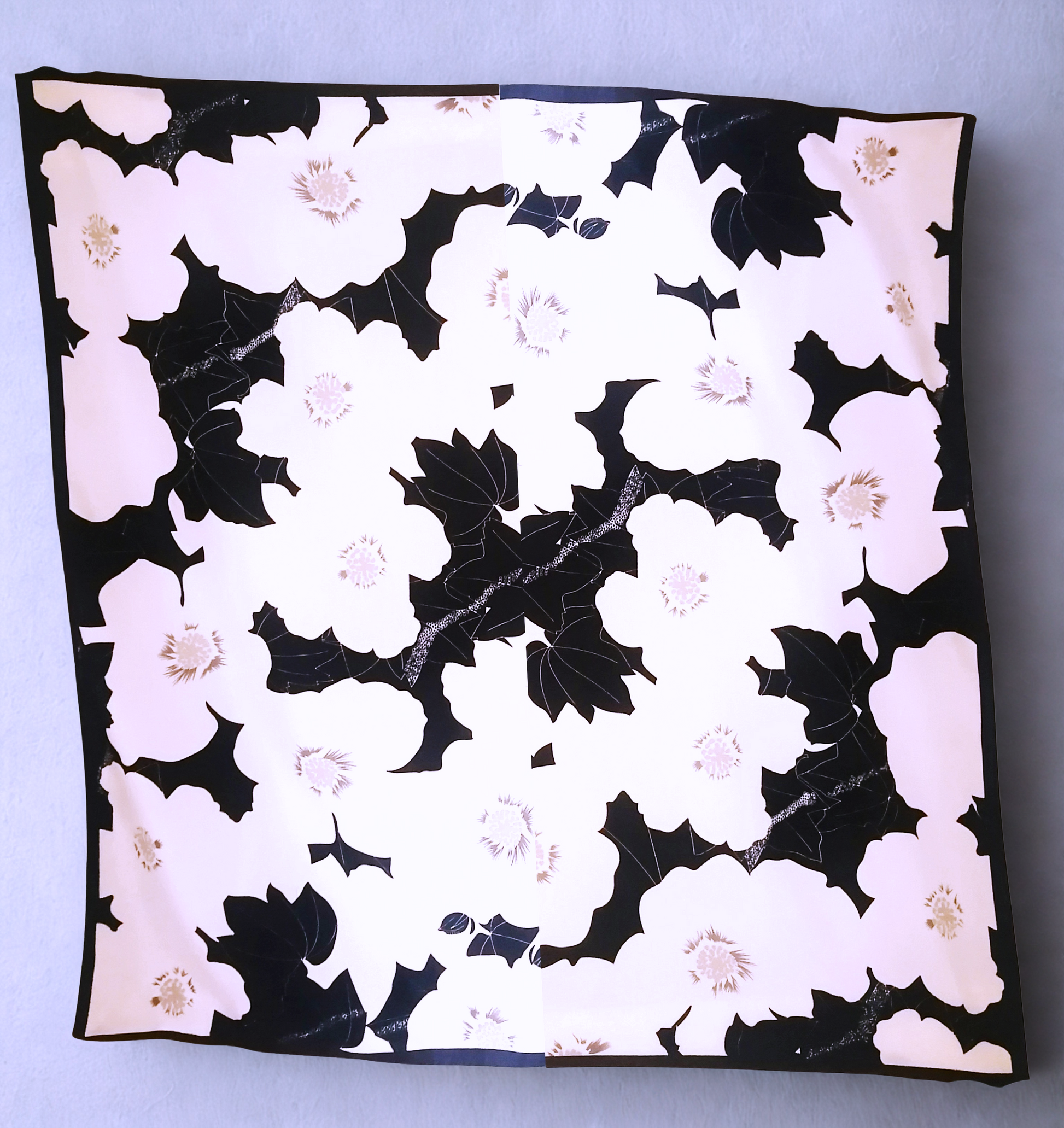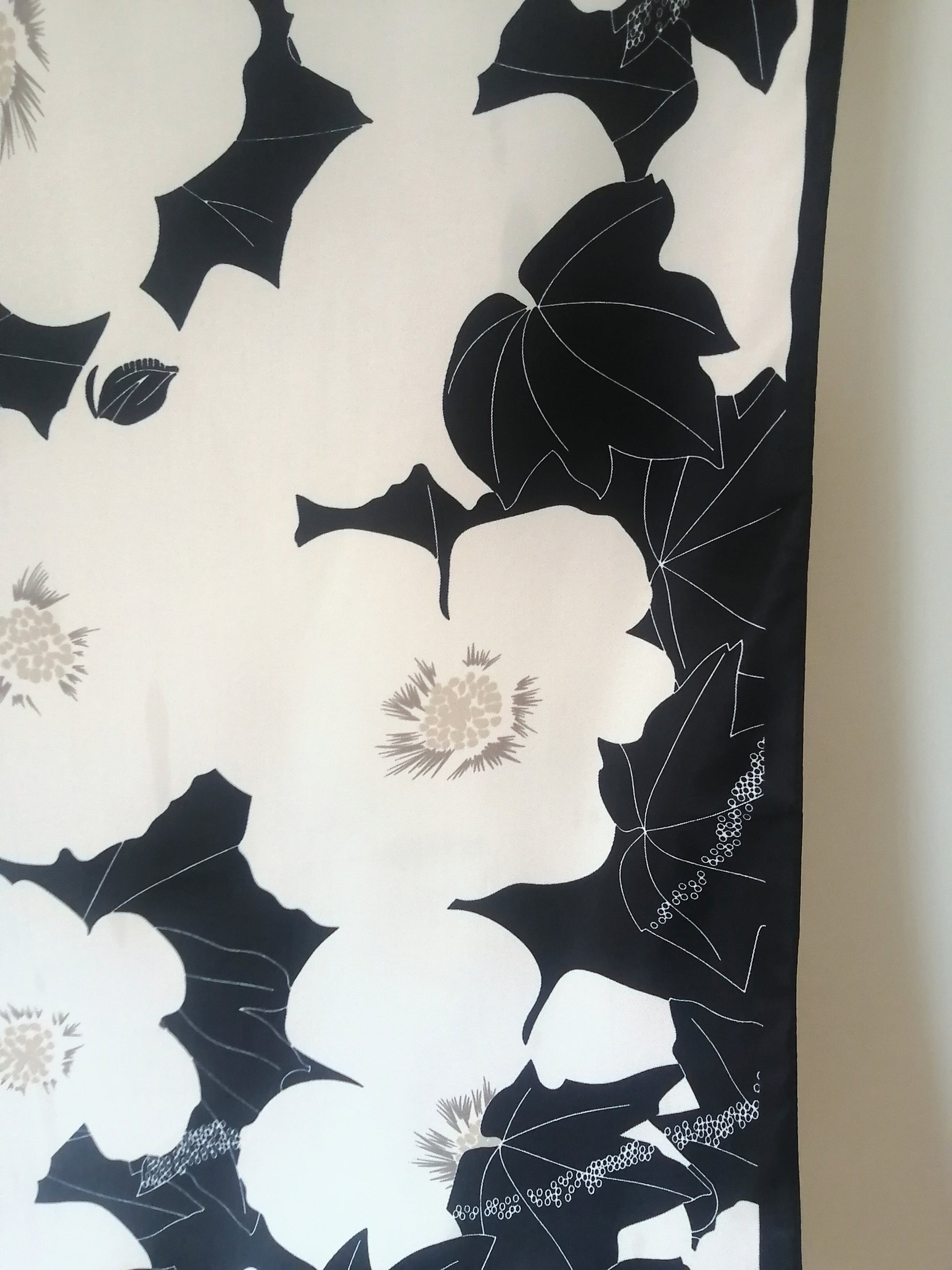 Pañuelo grande de 90 x 90 cms, en material satinado. Diseño de flores grandes blancas sobre fondo negro. Es ligero.