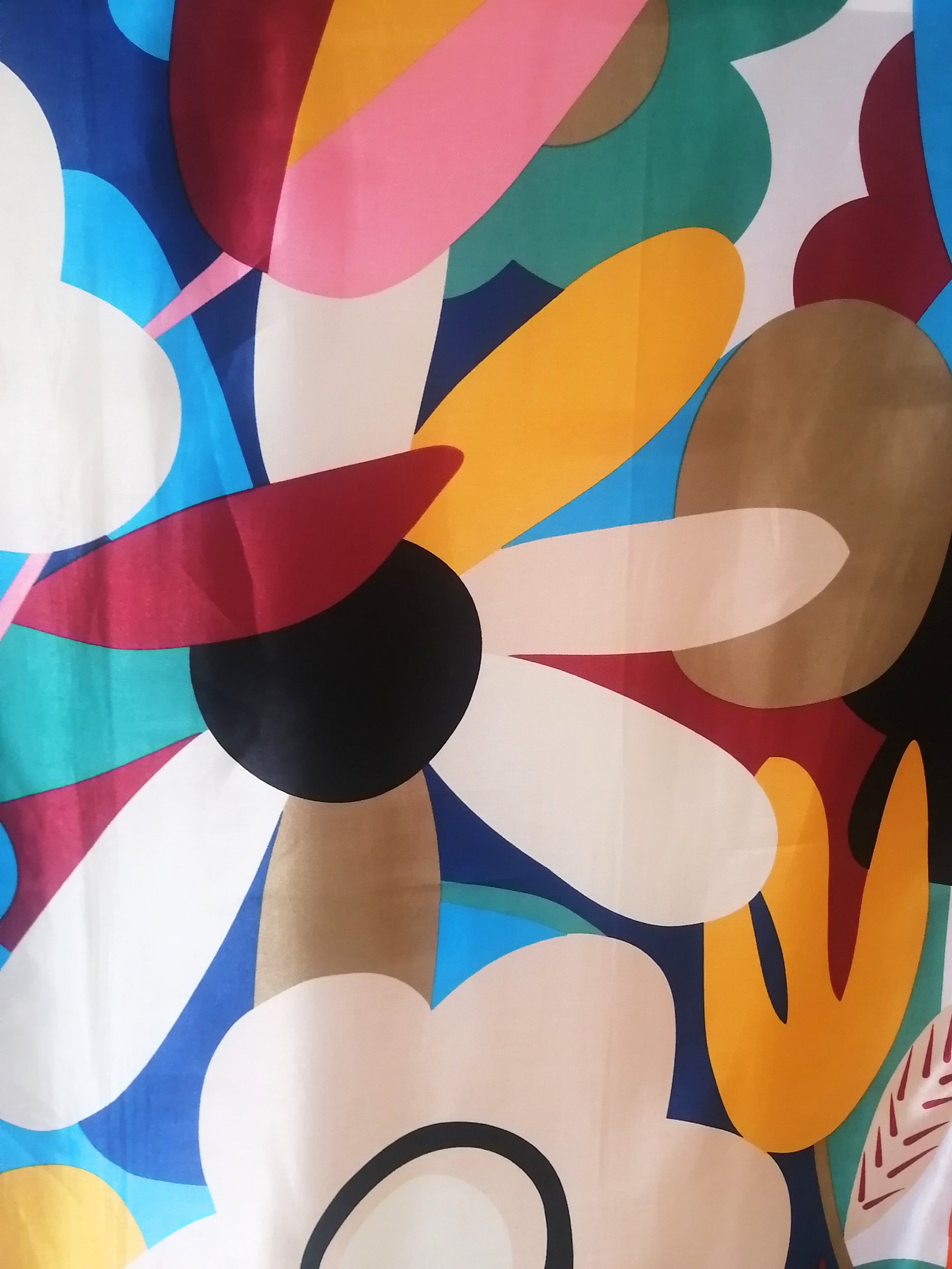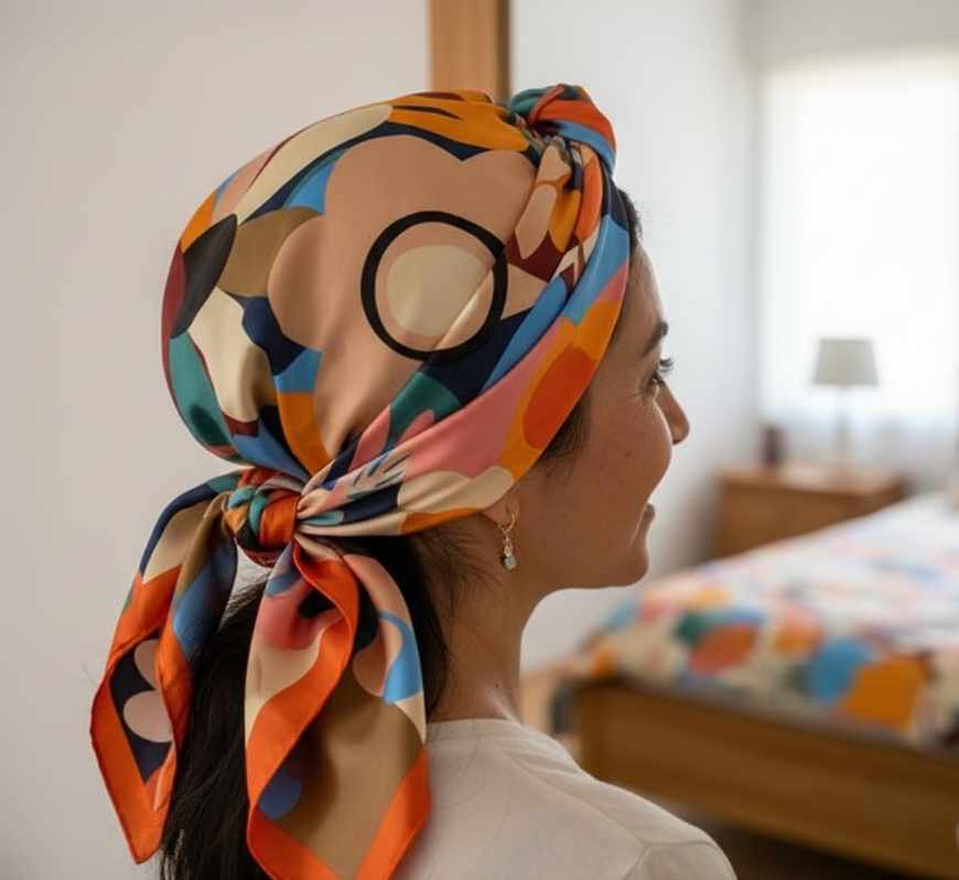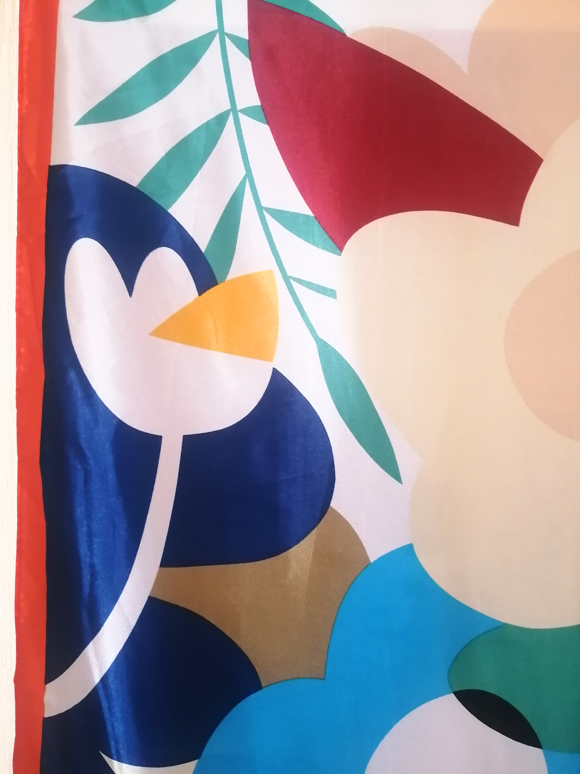 Pañuelo grande de 90 x 90 cms, en material satinado. Diseño floral, con borde naranjo. Es ligero.