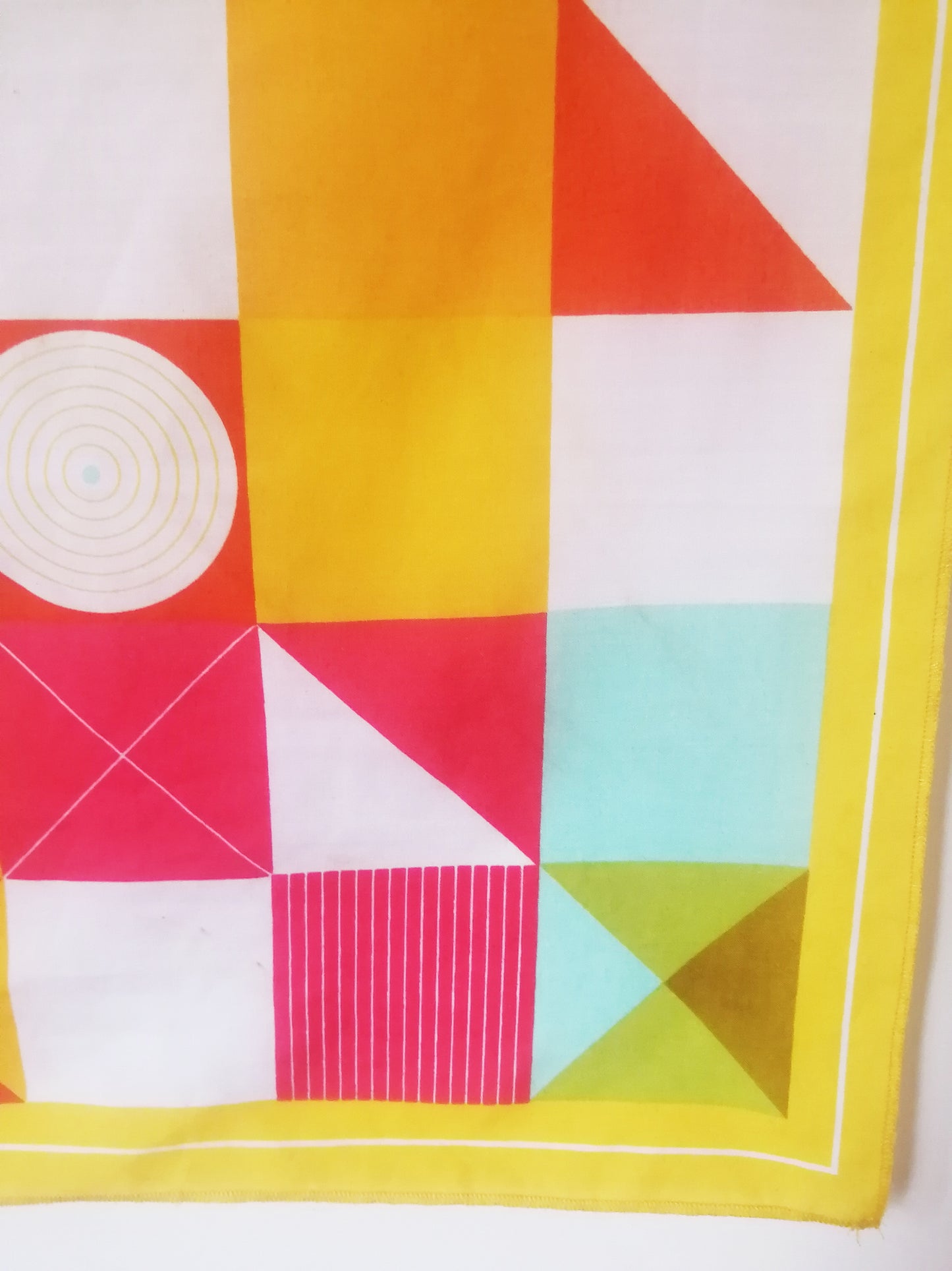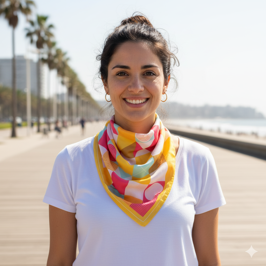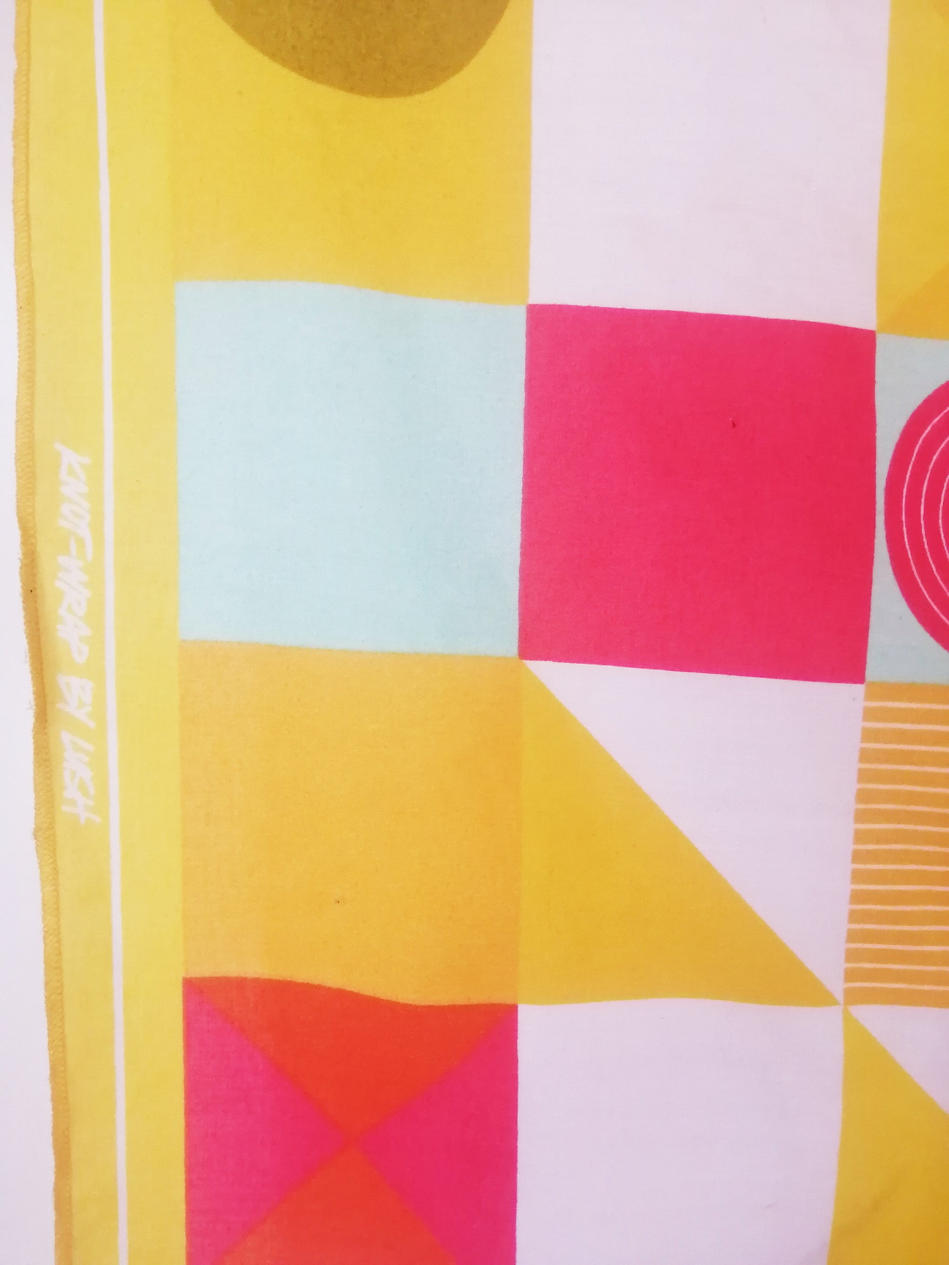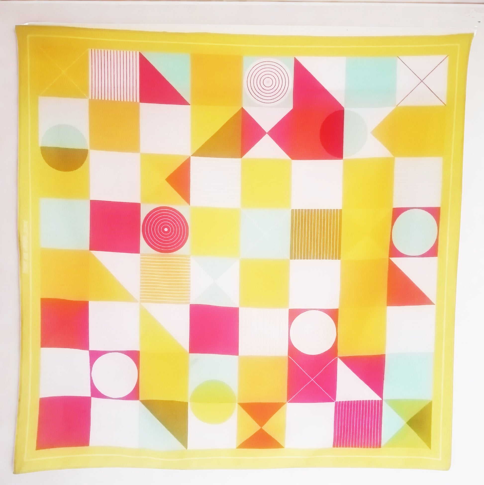 Pañuelo mediano de 70 x 70 cms, en tela no muy delgada. Tiene un diseño en donde predomina el color amarillo, es de la marca LUSH (sí, la de los shampoos ricos). Es totalmente ondero para la primavera o verano por los colores.
