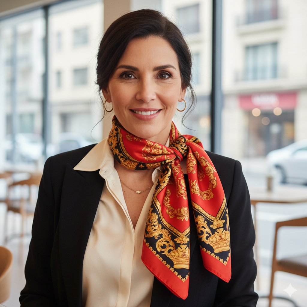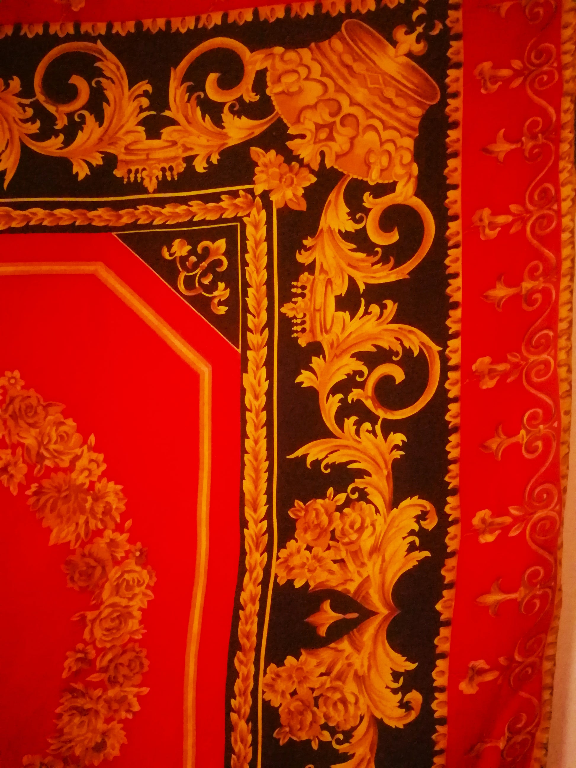 Pañuelo grande de 90 x 90 cms, en material satinado. Diseño en donde predomina el rojo, tiene detalles dorados y en menor cantidad negro. Es bellísimo, de material ligero.